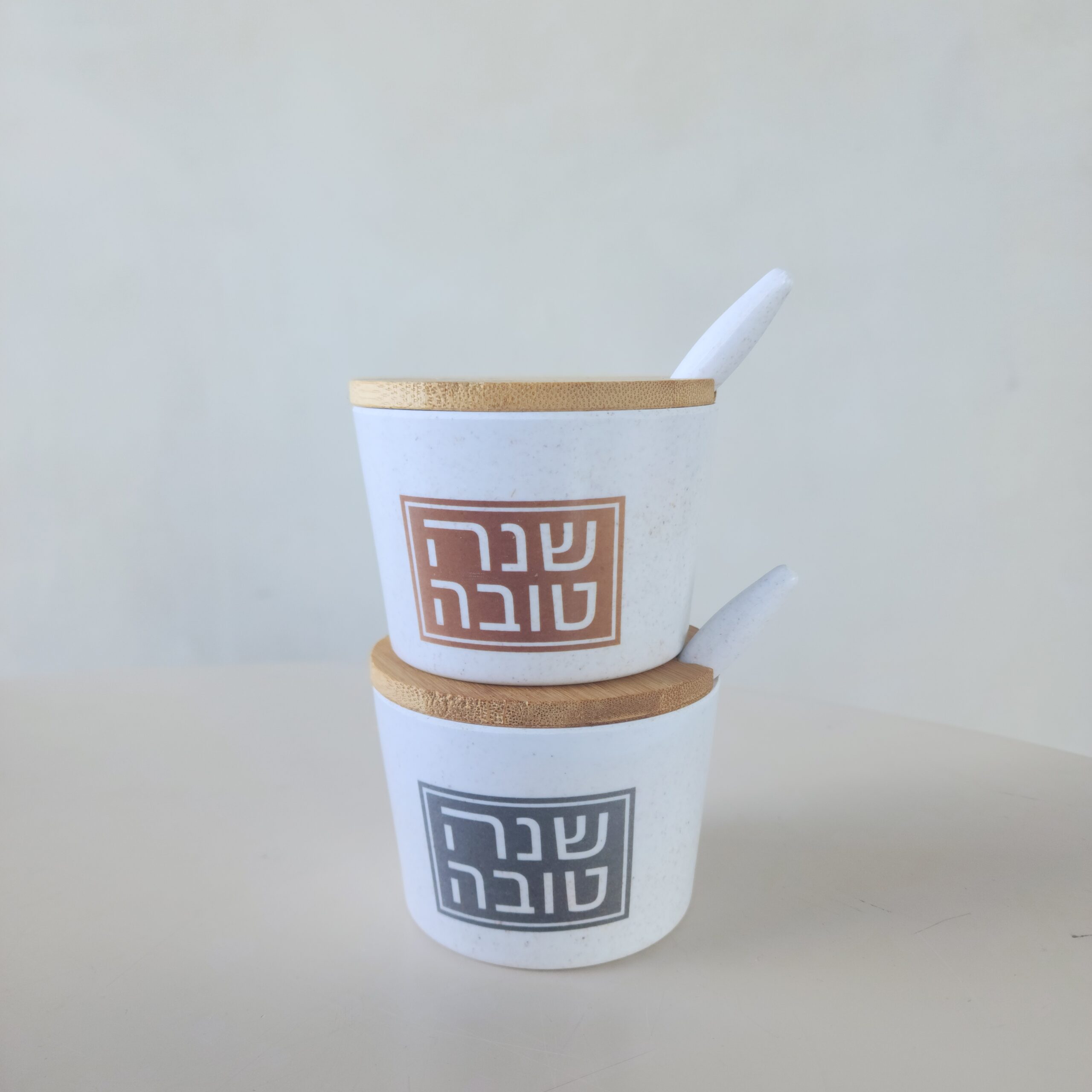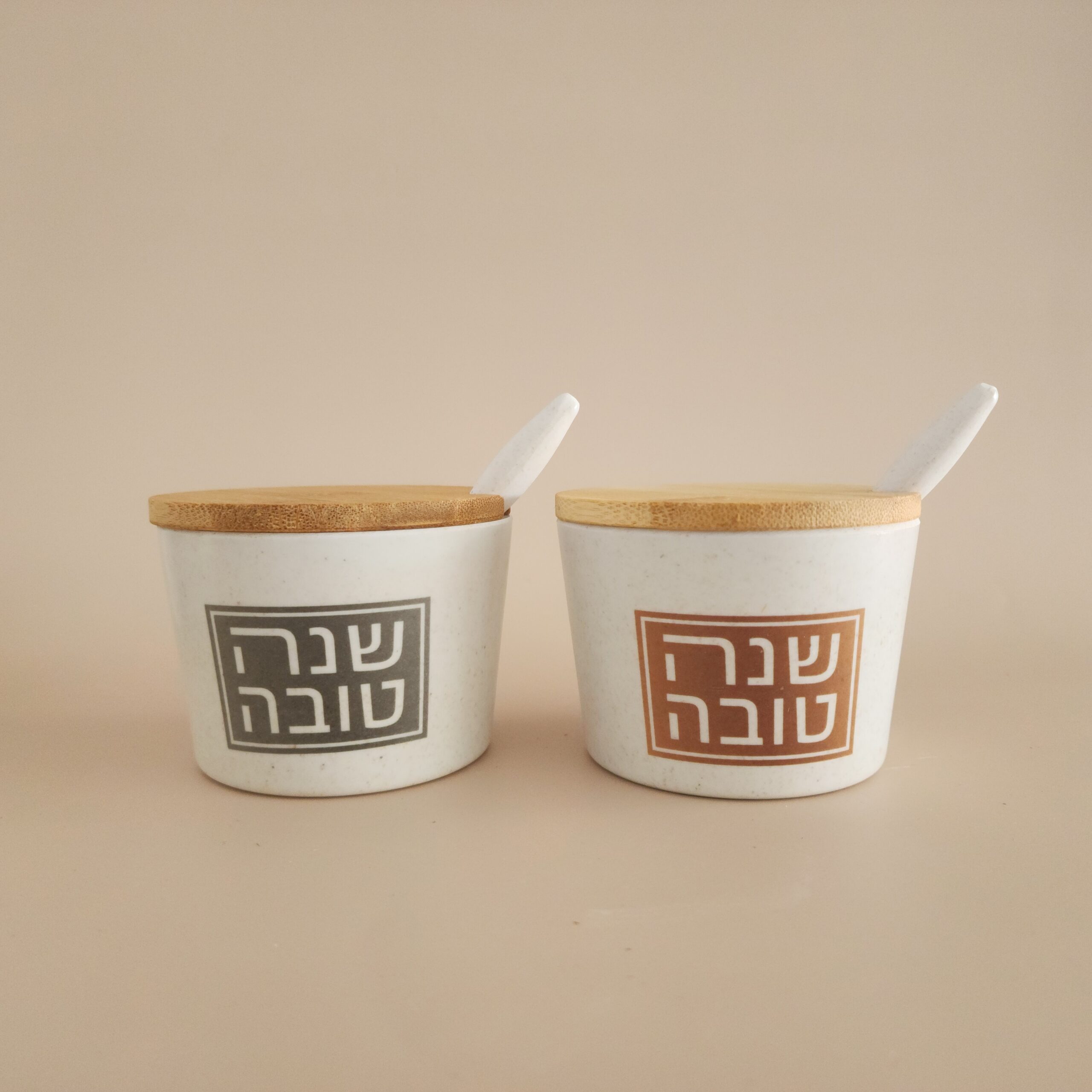 הכלי עשוי מלמין עמיד, בקוטר 6.5 ס"מ, לצידו כפית תואמת להגשה נוחה ומכסה עשוי עץ במבוק טבעי.
